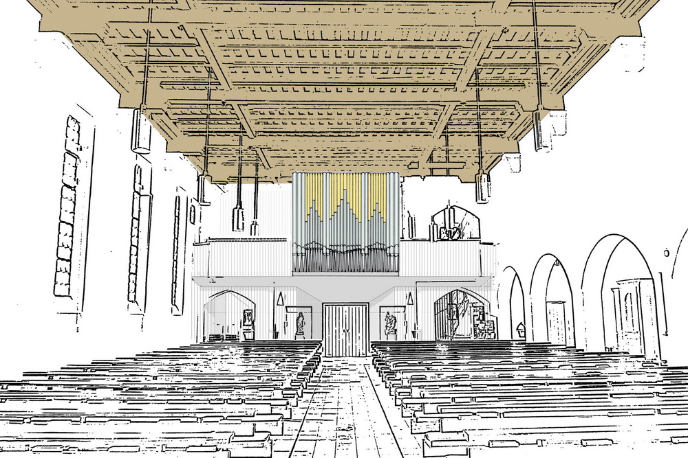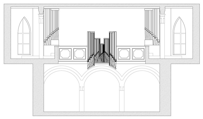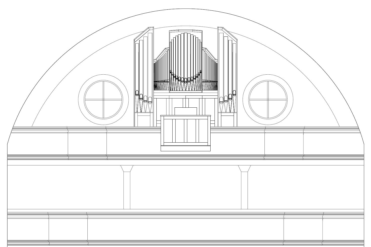 In dieser langgezogenen Kirche konnte die alte Orgel, platziert am Ende der tiefen Empore, von Raum aus nur eingeschränkt gesehen und gehört werden. Unsere Konzeption stellt das kräftige Hauptwerk in die Brüstung, Schwellwerk und Pedal flankieren es seitlich und nach vorn versetzt.